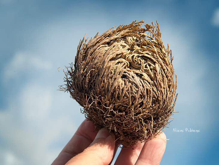 Παράξενο χορτάρι, αλήθεια, το βοτάνι των Χριστουγέννων! Κατάξερο, τυλιγμένο σε λευκή πετσέτα και φυλαγμένο για χρόνια και χρόνια στην κασέλα, ανασύρεται μόνο για να μεταφέρει στους ανθρώπους την ακατανίκητη δύναμη που κρύβεται μέσα του. Το λένε «χέρι της Παναγιάς» ή και «φύλλο της Παναγιάς», μα δεν μοιάζει με τα φύλλα που ξέρομε. Αμέτρητα λεπτά κλαδάκια ξεπετάγονται από τη ρίζα του, κι όταν αρχίζει να ξεραίνεται στρέφονται όλα μαζί προς τα μέσα, το ένα πάνω στο άλλο, έτσι που να σχηματίζουν σφιχτοδεμένο κουβάρι.