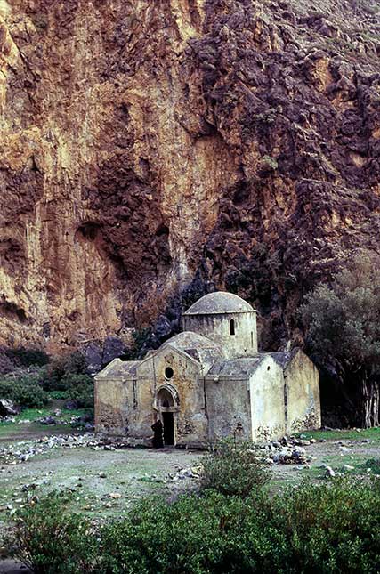 Ένα θαύμα της αρχιτεκτονικής στις ερημιές του κρητικού Νότου! Χτίστηκε γύρω στο 1400 πλάι στην κάθετη πλαγιά του φαραγγιού, κάμποσες δεκάδες μέτρα από την έρημη ακρογιαλιά του Λιβυκού. Και χτίστηκε για να στεγάσει το άυλο: την προσευχή και την ελπίδα! Κι ακόμη, να στεγάσει την παράδοση που μιλούσε από τότε για τ' αγιοβάδιστα μονοπάτια του τόπου.