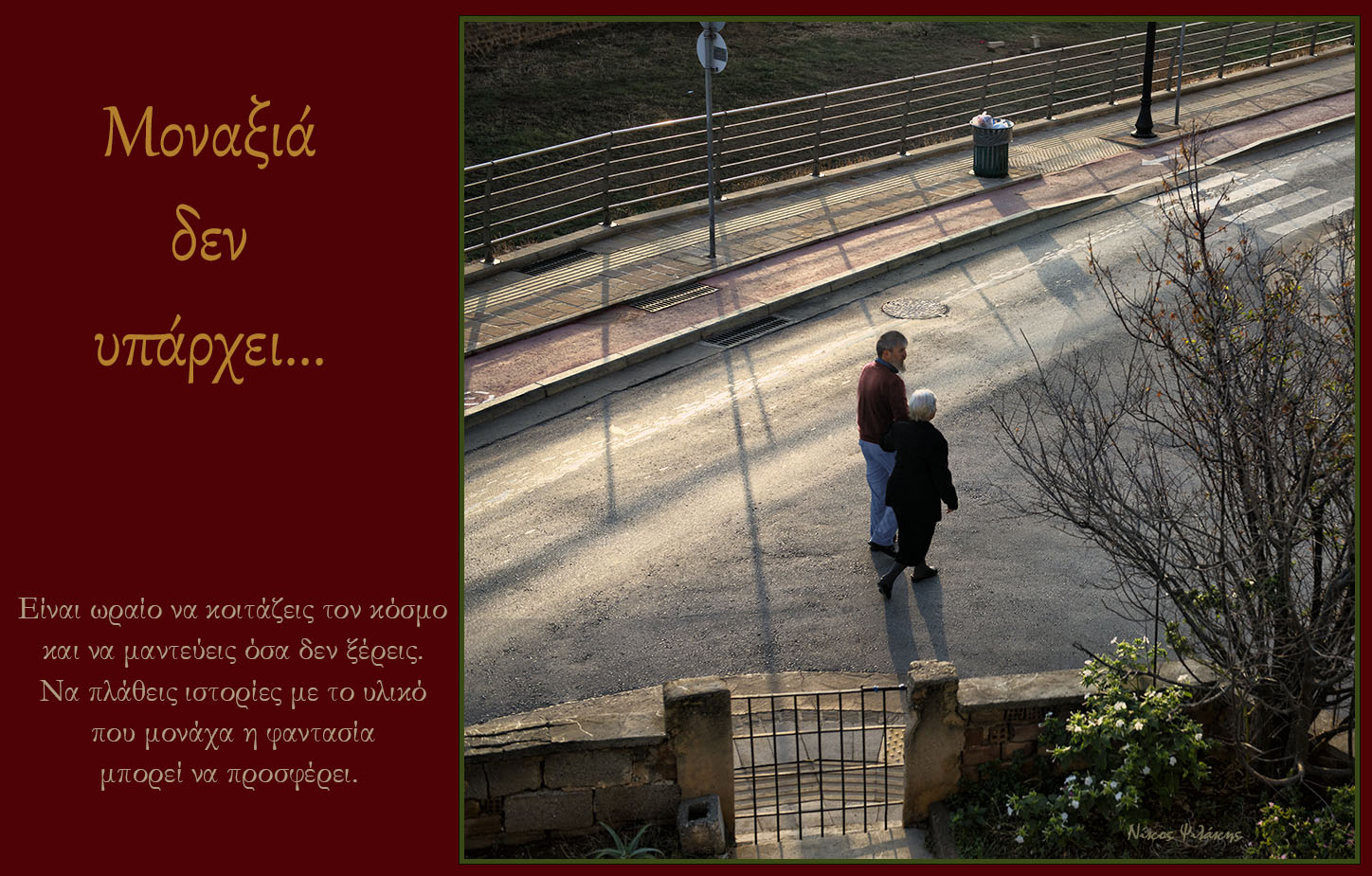 Είναι ωραίο να κοιτάζεις τον κόσμο και να μαντεύεις όσα δεν ξέρεις. Να πλάθεις ιστορίες με το υλικό που μονάχα η φαντασία προσφέρει. Μια εικόνα που βλέπεις τυχαία στον δρόμο μπορεί να κάμει πιο όμορφο το δικό σου πρωινό. Ιδιαίτερα όταν ψάχνεις λέξεις για να βάλεις λεζάντα και σου έρχεται μονάχα μια στο νου: Ανθρωπιά!