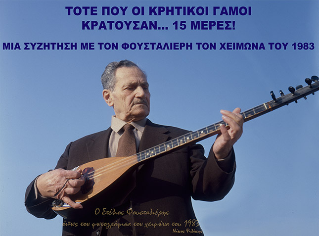 Δημοσίευσα μια συνέντευξη του στις Κρητικές Εικόνες, το περιοδικό που εξέδιδα τότε, τον Μάρτη του 1983. Και τώρα ξετυλίγω πάλι το κουβάρι του χρόνου, ξαναδιαβάζω τα λόγια του, τον ακούω να μιλά για τις χαρές και τις πίκρες που σημάδεψαν την πορεία του, τον ακολουθώ νοερά στα παλιά σφακιανά γλέντια, νιώθω τα όρια του χρόνου να καταργούνται... Τα γλέντια κρατούσαν τότε... 15 μέρες!